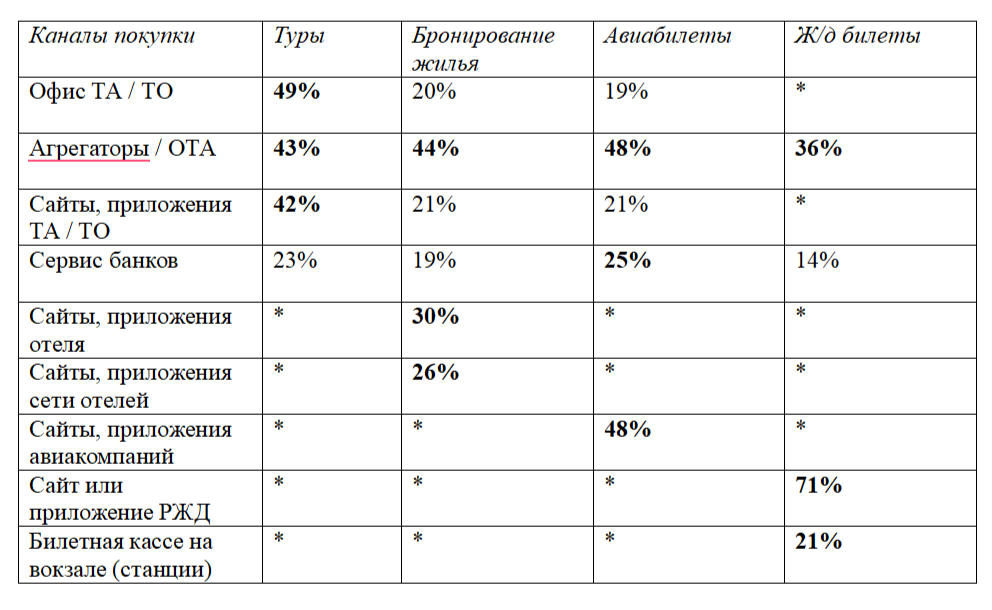 Вездесущи - агрегаторы и сервисы банковИменно на них представлены все услуги, связанные с поездками - как показывают данные онлайн-опроса (сентбярь 2025) путешественников на предмет способов покупки туристических услуг, представленные Яндексом на конференции Industry Day: Travel&Avia 30 октября. Офисы, сайты и приложения турагентов и туроператоров также активно участвуют в процессе - кроме реализации ж/д билетов.